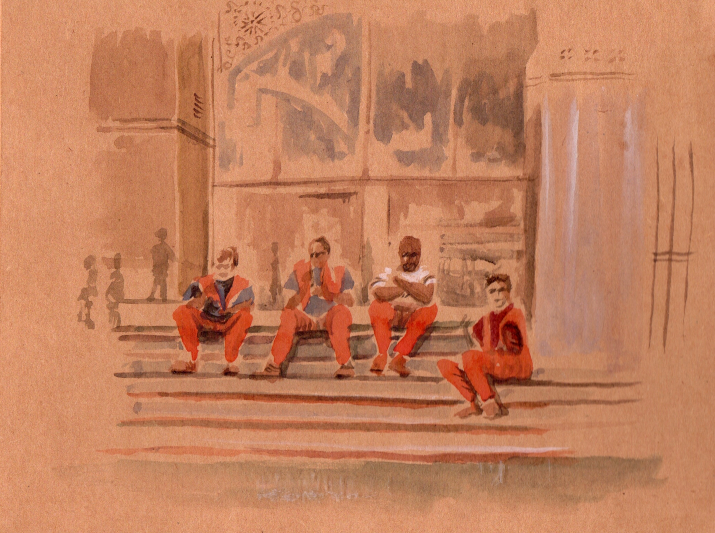 I spotted four refuse collectors on a lunch break sitting on the steps at the back, they came over to see the drawing when their break had finished.